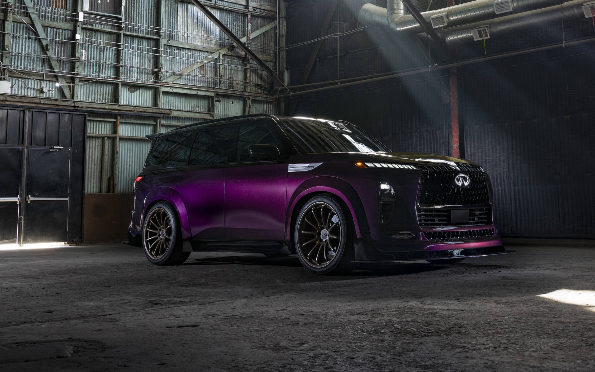 Sa silhouette demeure très carrée, très américaine, avec une calandre plus imposante et des feux de jour redessinés qui évoquent une forêt de bambou, nous dit Infiniti, tandis que les feux arrière pleine largeur utilisent plus de 300 DEL pour imiter les reflets de la lumière sur un plan d'eau. Une séquence d'éclairage de bienvenue s’active à l’approche du véhicule.