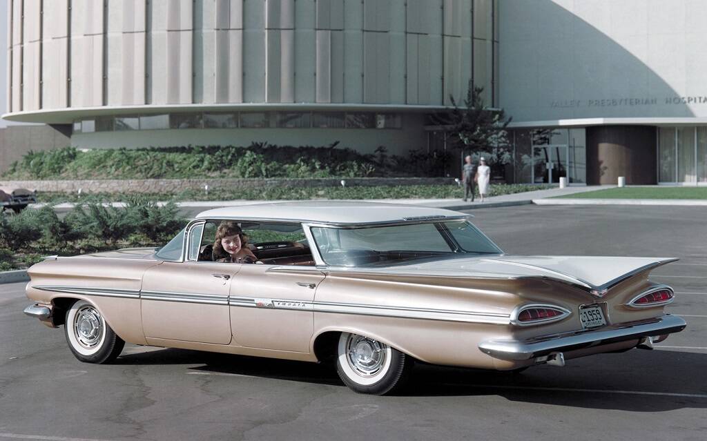 L’histoire du développement de la gamme GM 1959 mériterait un article complet à elle toute seule. Pour faire court, les designers de GM, en apercevant les nouveaux modèles Chrysler 1957 dans le stationnement d’une usine ont compris qu’ils venaient de prendre 5 ans de retard. Ils vont organiser en urgence une refonte complète des produits pour 1959 (les modèles 1958 étaient déjà gelés). Séduite par l’idée, la direction va ordonner le développement de nouveaux modèles pour les cinq divisions simultanément, du jamais vu dans l’histoire de la compagnie. C’est pour cela que la Chevrolet 1958, entièrement renouvelée, ne durera qu’un an alors que le cycle de vie traditionnel d’un modèle était de trois ans.