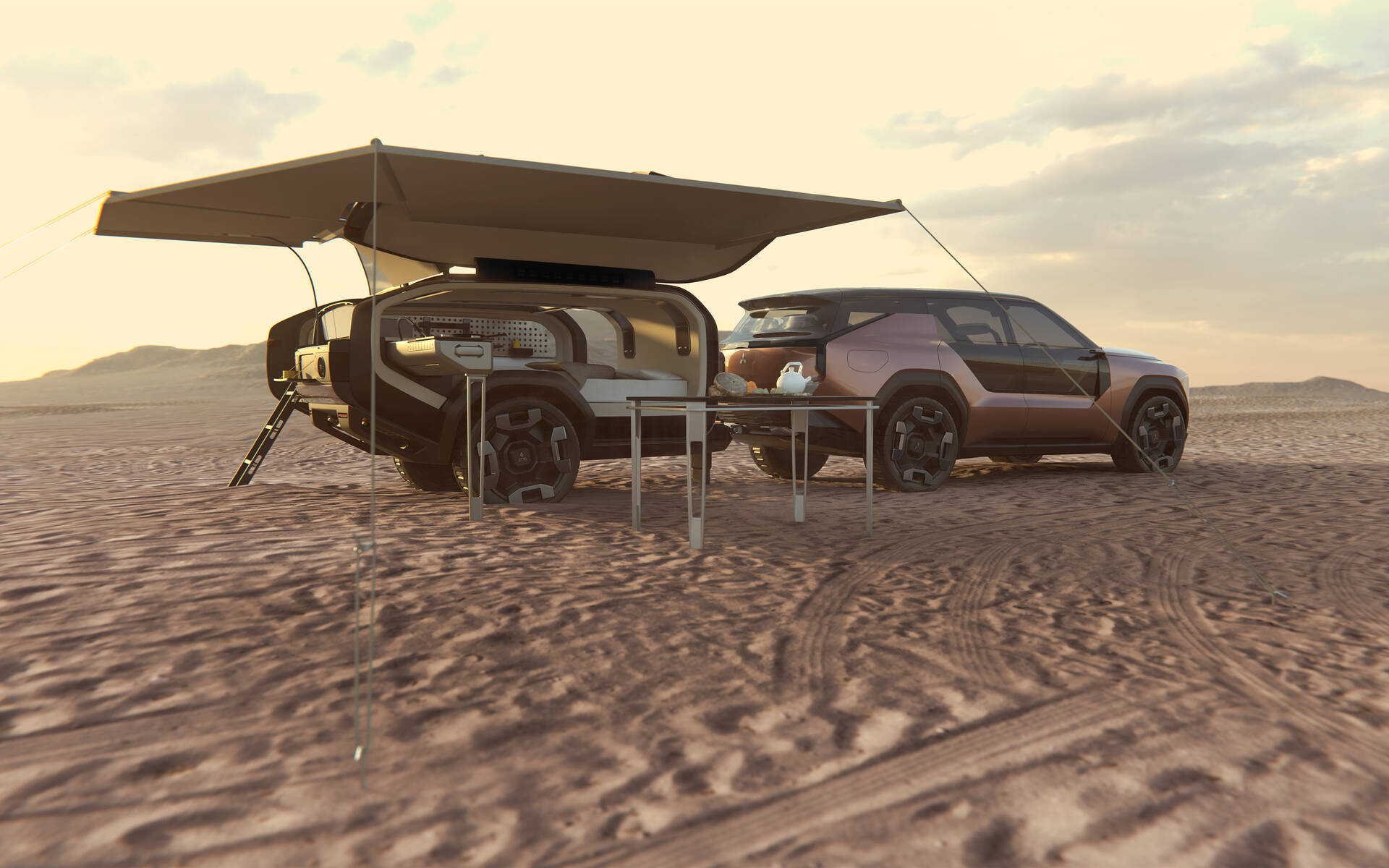 En revanche, le concept fait appel à quatre moteurs électriques et un moteur thermique compatible avec les carburants carboneutres pour recharger la batterie. Notez qu’à l’avant, chaque moteur électrique est lié à une roue directrice, tandis qu’au deuxième essieu, les ingénieurs ont plutôt regroupé la paire de moteurs pour optimiser la motricité avec un contrôle actif du lacet. Mitsubishi promet une grande autonomie en mode électrique pour le quotidien, mais celle-ci a aussi la capacité d’alimenter un campement ou une remorque comme c’est le cas ici.