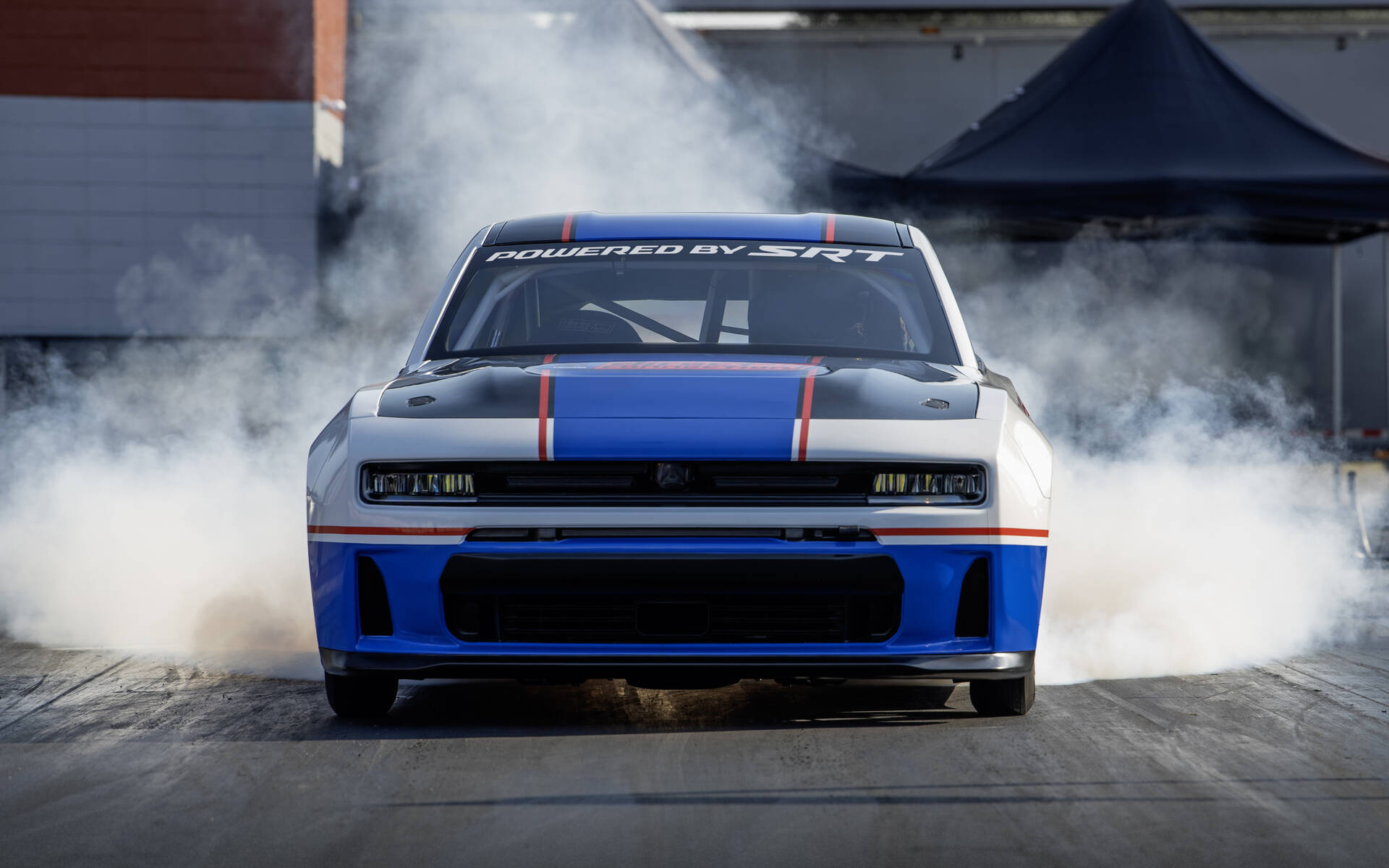 La Charger Hustle Stuff Drag Pak devient la première voiture de course à porter le sceau de la division SRT Performance qui avait été dissimulée derrière les rideaux depuis quelques années. Cette division chapeaute désormais l’ensemble des projets sportifs des marques américaines de Stellantis — allant des modèles SRT aux pièces Direct Connection, sans oublier le retour de Ram au sein de la NASCAR Truck Series dès 2026.