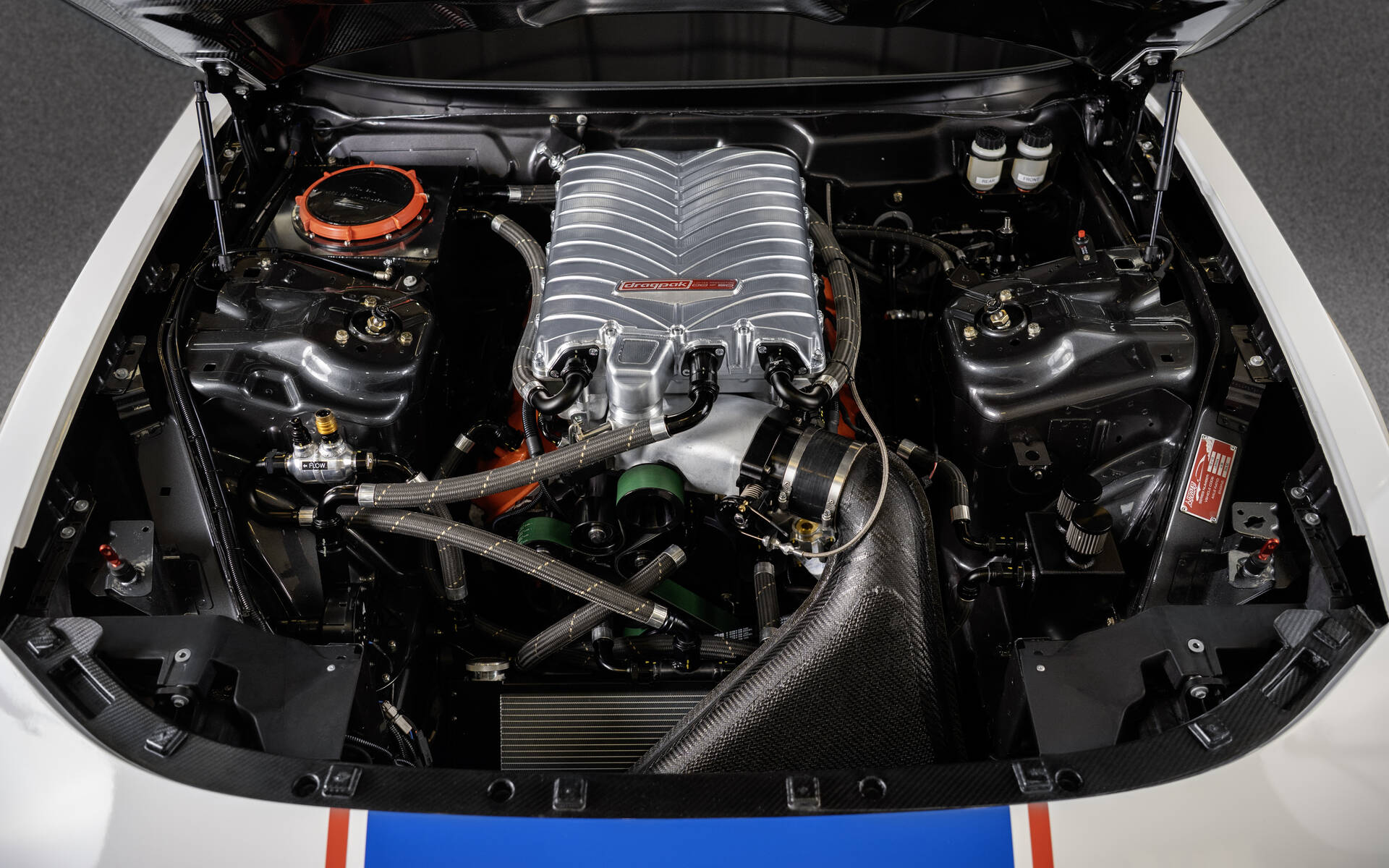 Sous le capot, les habitués du programme Drag Pak ne seront aucunement surpris d’apprendre qu’un moteur V8 HEMI suralimenté de 354 pouces cubes (5,8 litres) prend place à cet endroit pour propulser le bolide. Ce bloc, qui a déjà fait ses preuves dans l’ancienne Challenger, est coiffé d’un compresseur volumétrique Whipple de 3 litres.