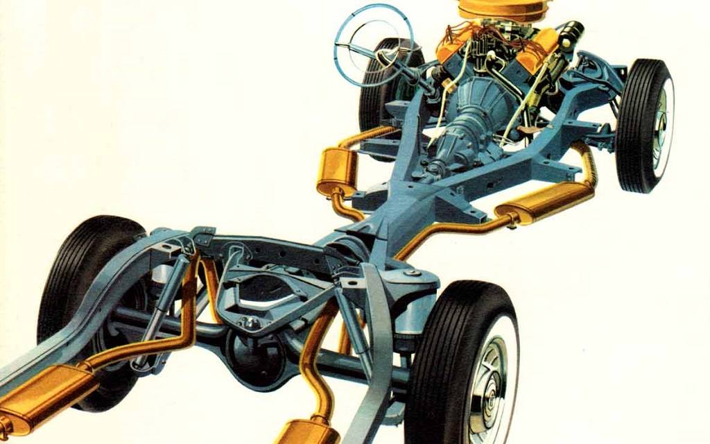 Le châssis en X, inauguré chez Cadillac en 1957 et qui permet d’abaisser la hauteur de la voiture, repose sur quatre amortisseurs hélicoïdaux de série mais il est possible d’obtenir en option une suspension pneumatique (chère et peu fiable, celle-ci restera très confidentielle et sera même souvent remplacée par un amortissement conventionnel par les propriétaires). Là encore, il y a de la rationalisation dans l’air. Si la gamme Cadillac 1958 utilisait quatre empattements différents, il n’en reste plus que deux en 1959 : 149,8 pouces (3,80 m) pour les limousines et châssis commerciaux (dont la plus célèbre incarnation sera l’ECTO-1 du film « Ghostbusters » de 1984) et 130 pouces (3,30 m) pour tous les autres modèles. Les longueurs sont de 225 pouces (5,71 m) pour la gamme classique et de 244,8 pouces (6,22 m) pour les limousines.