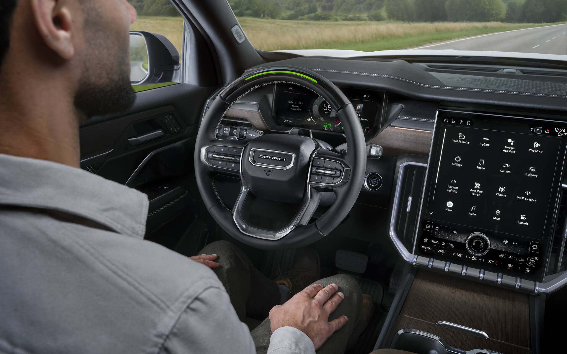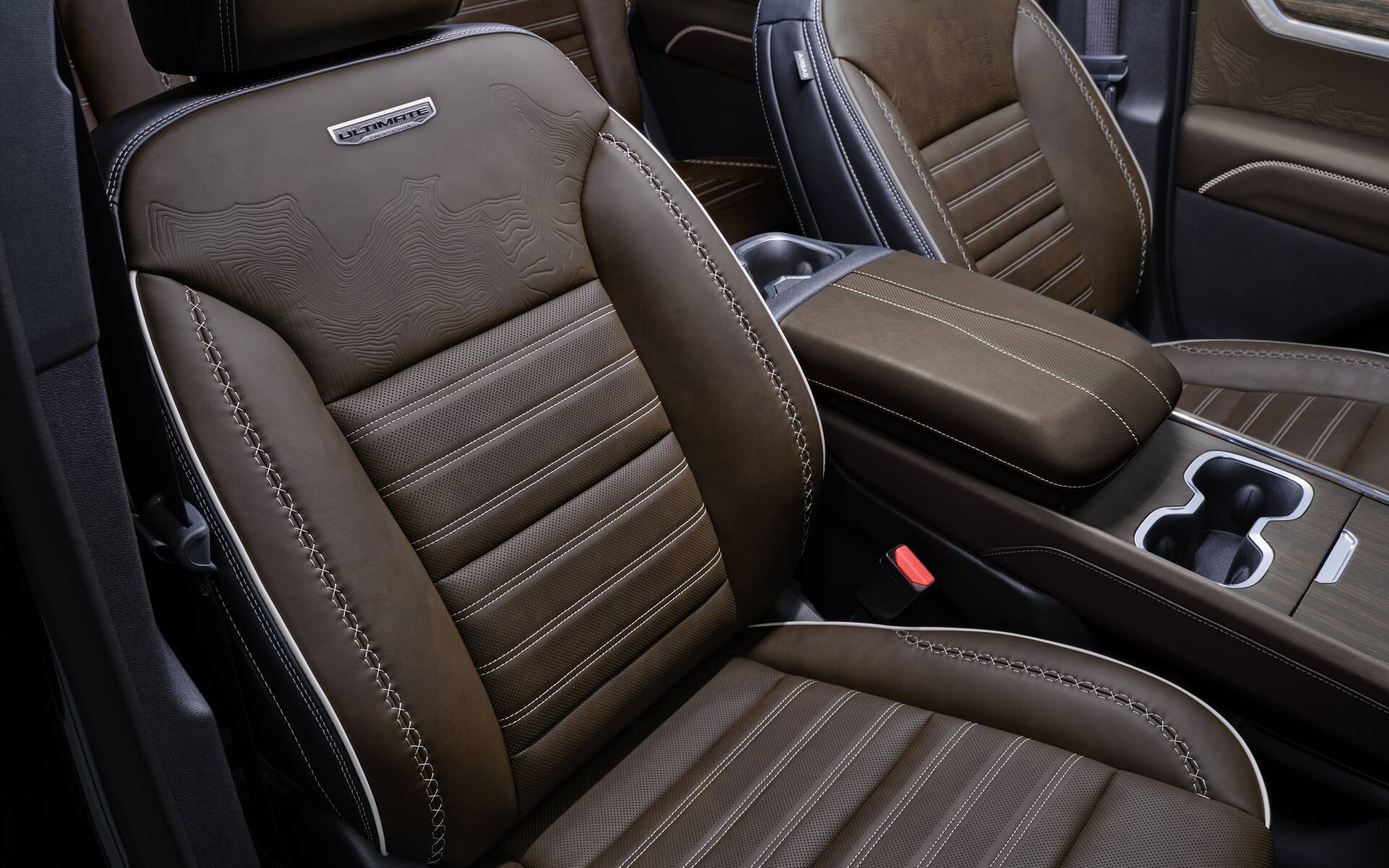 Inside, the Denali Ultimate treatment includes Woodland Mahogany full leather upholstery with plaited contrast stitching. The front seats are heated and ventilated, feature embossed topographical maps on the seatbacks (just like the door panels) and offer a massaging function.