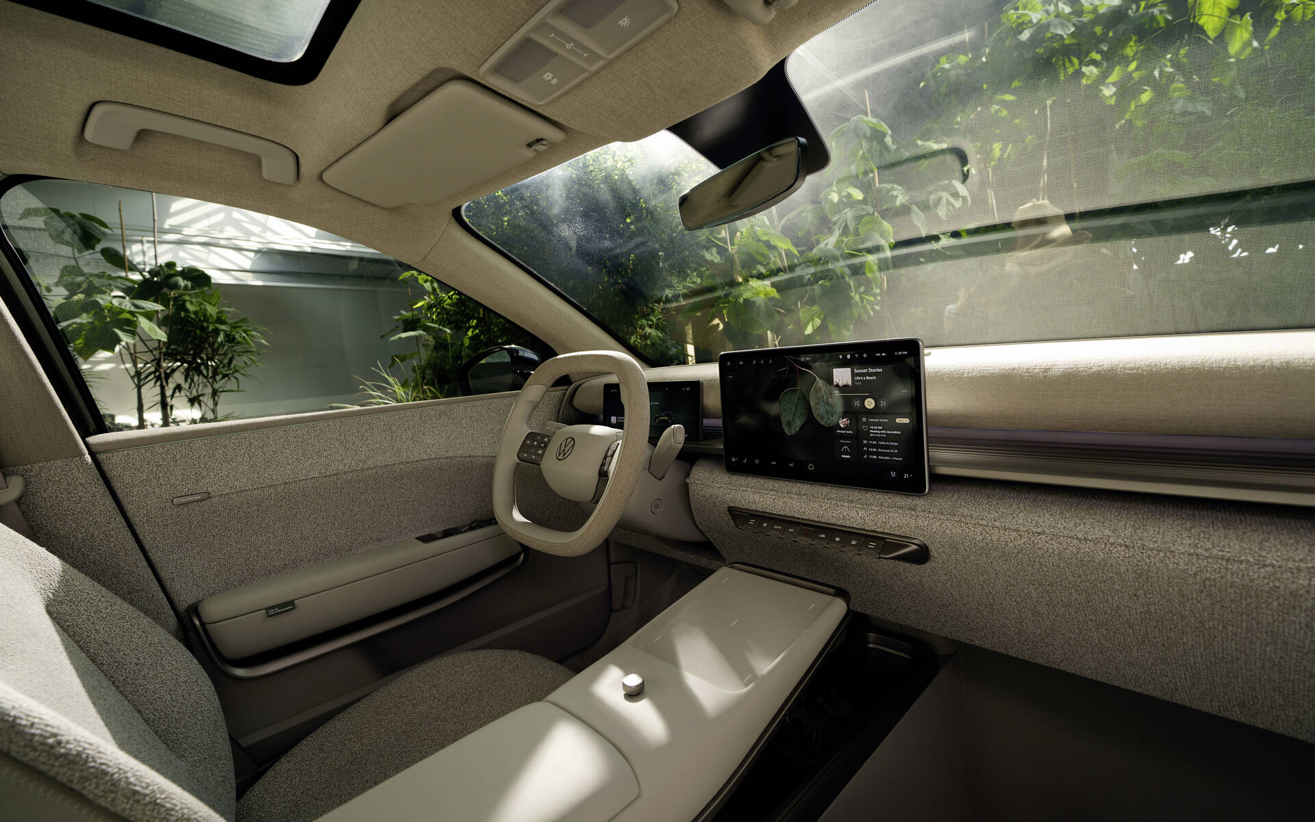 Speaking of the cabin, the ambiance is that of a lounge or, as Volkswagen puts it, a "feel-good oasis." Consider the plant motifs on the screens and the real plants within the floating centre console. Many surfaces are covered in a thick Vanilla Chai (beige) fabric that takes us back to the 1980s. Also, the seats fold completely flat to create a reclining area in the style of a VW Bus.