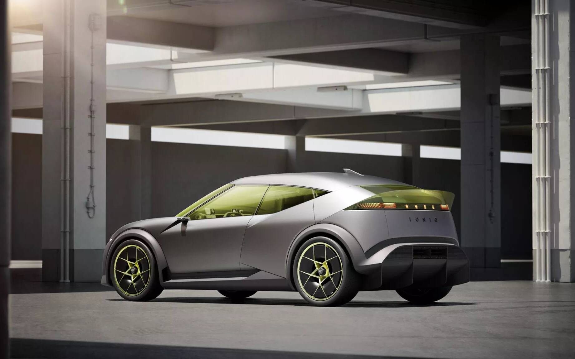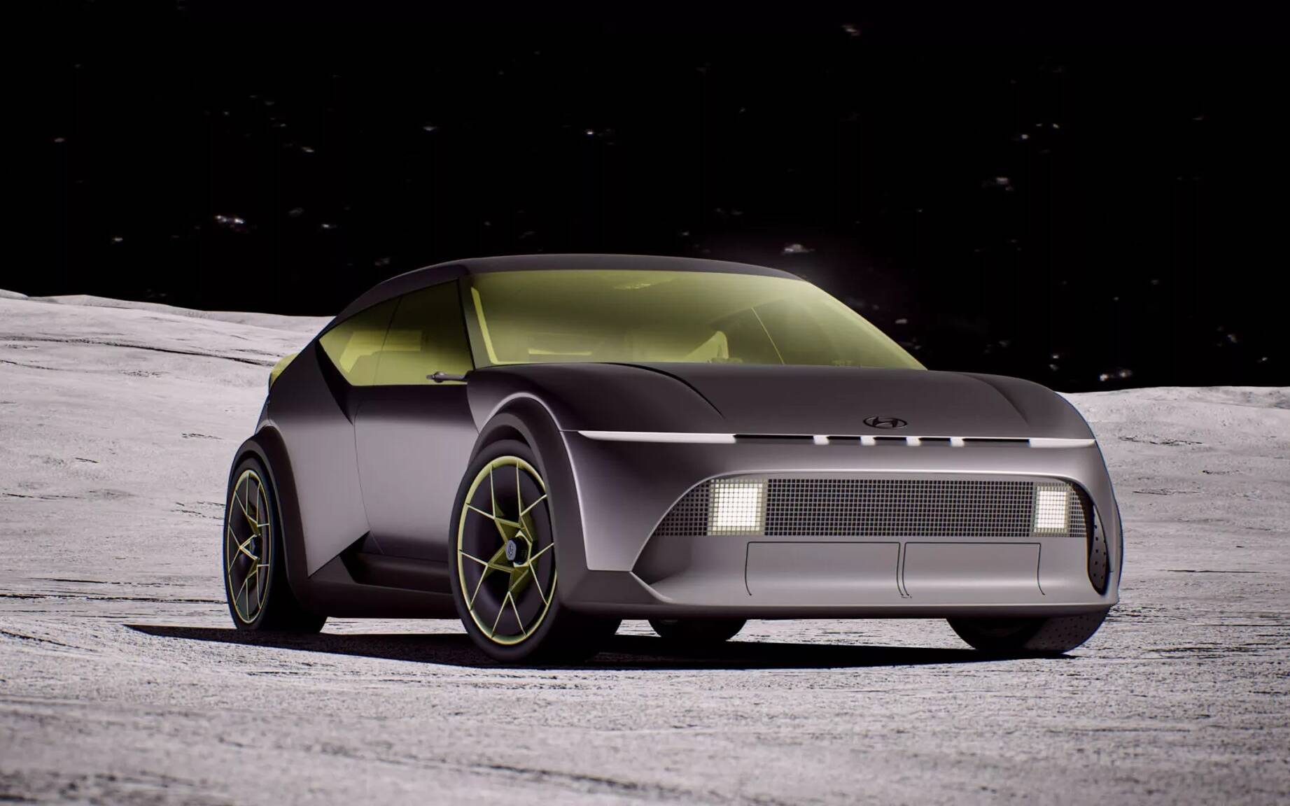 At 4,287 mm long, 1,940 mm wide and 1,428 mm tall, the small hatchback concept is just a tad larger than the discontinued Hyundai Veloster, with a somewhat similar silhouette. Its body, painted in Tungsten Gray with an anodized finish, displays a sculpted profile with a number of intersecting lines, while the rear section is highlighted by a wraparound, translucent spoiler and a huge diffuser below.