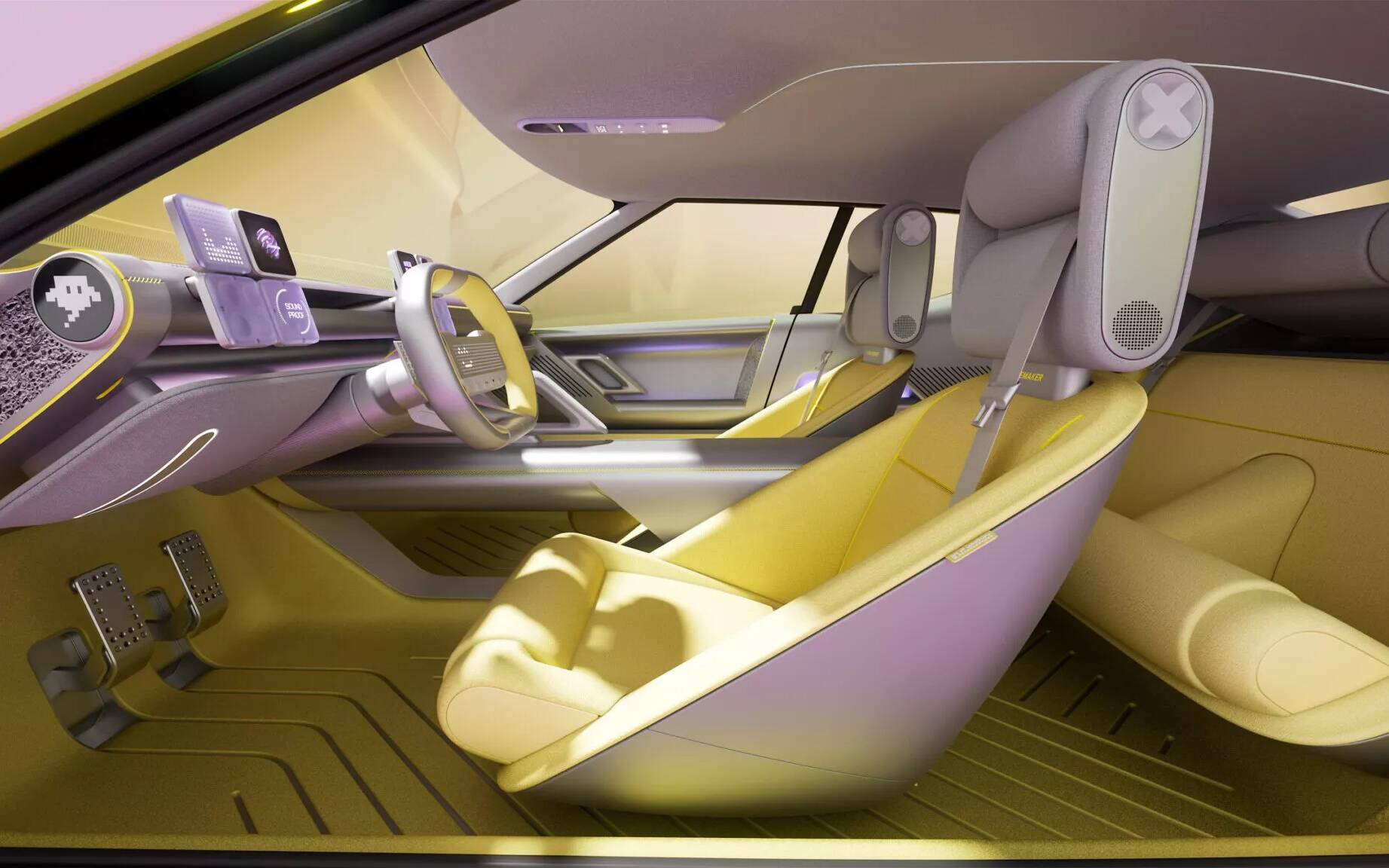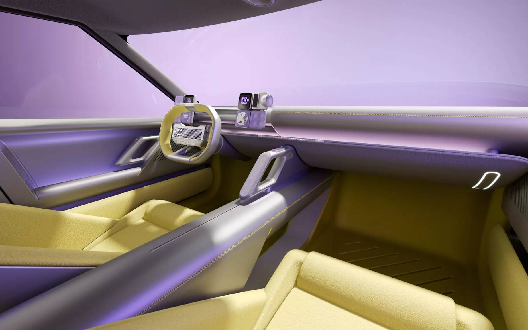 Lemon-tinted glass and matching wheels forge a strong link between the exterior and interior. In fact, the cabin is defined by soft Moonbeam Yellow and grey tonalities that play across shifting textures. Unsurprisingly, sustainable materials are used throughout, such as ocean waste textiles and lightweight aluminum foam.