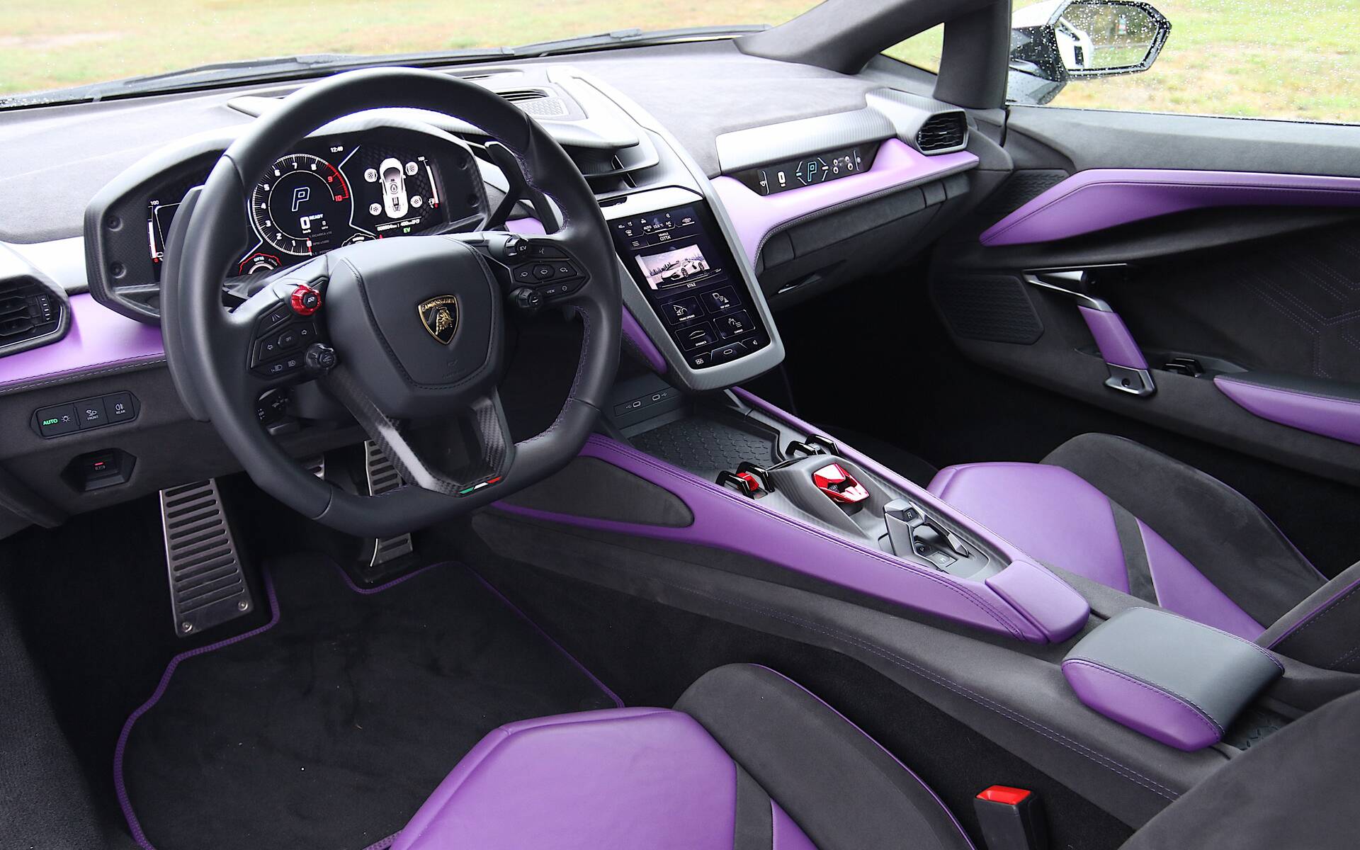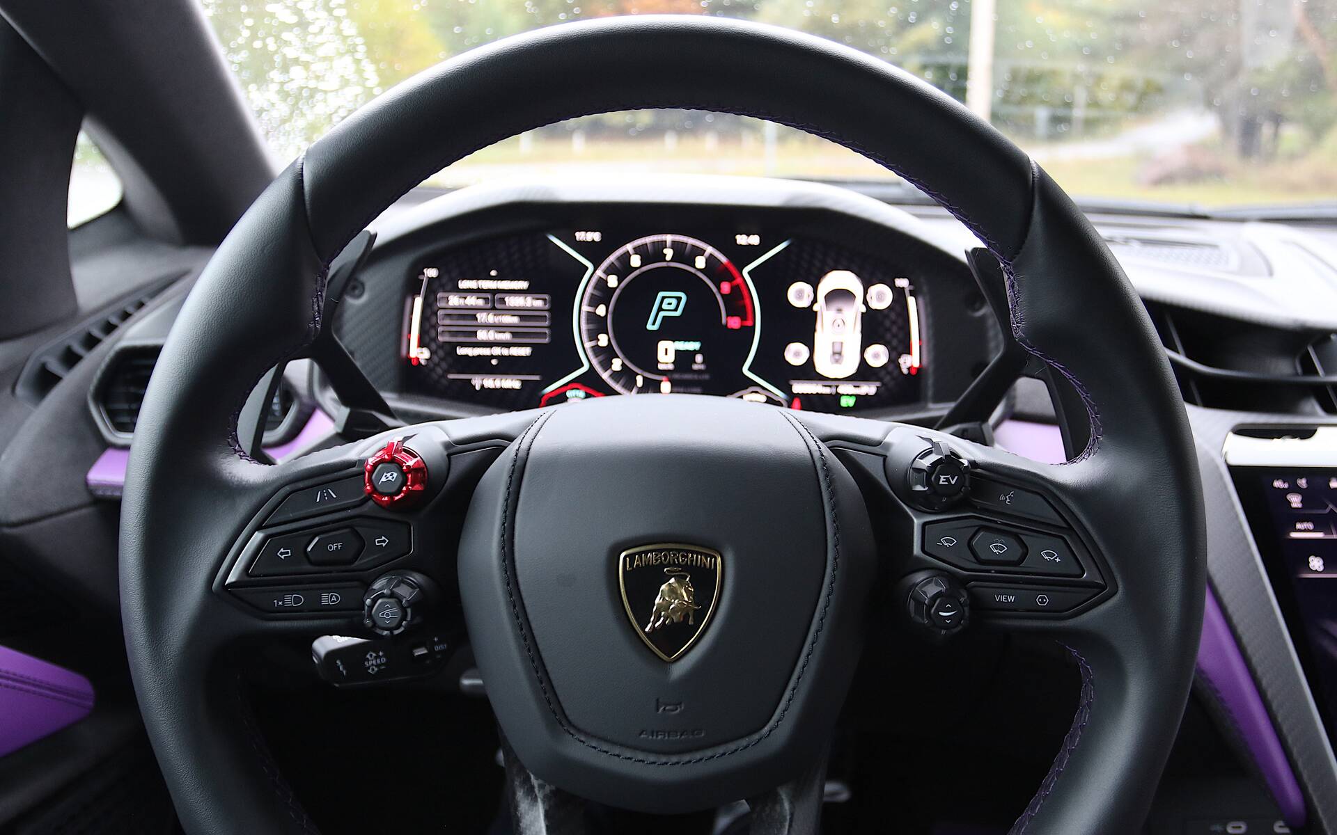 Ergonomically, the Revuelto has a few quicks. For instance, the turn signals and windshield wipers are operated by buttons on the steering wheel, leaving plenty of room for the large paddle shifters. With your hands at the 9 and 3 o’clock positions, buttons on the back of the steering wheel control various functions like radio volume, instrument panel display and more. It takes a few minutes to get used to, but we found the layout sensible and easy to use.