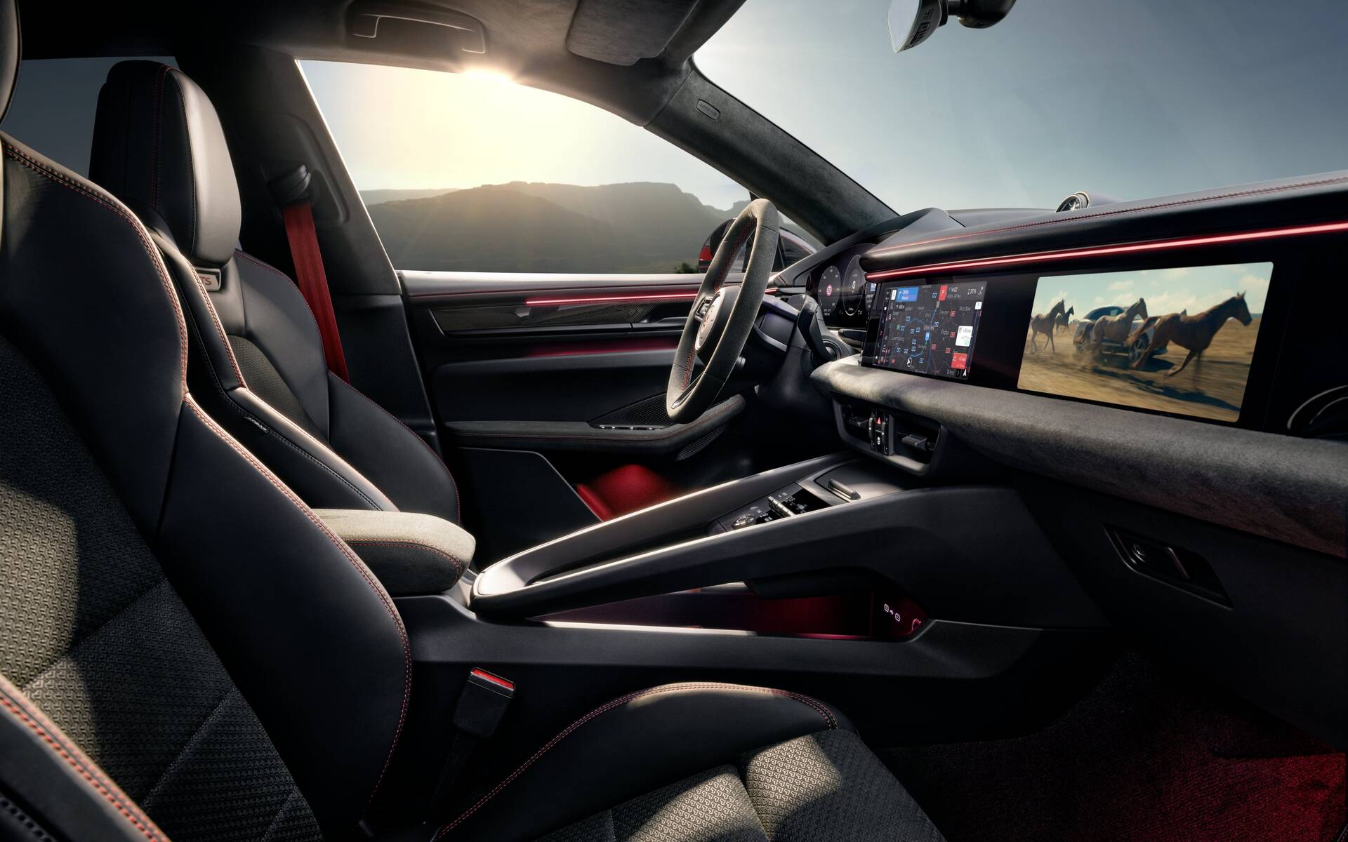 Finally, when opening the doors, you’ll see “GTS” lettering combined with Race-Tex fabric on the GT Sports steering wheel, the armrests of the centre console and door panels, as well as the dashboard. The middle section of the 18-way adjustable sports seats is also upholstered in Race-Tex, while the seat bolsters and headrests are finished in smooth leather.