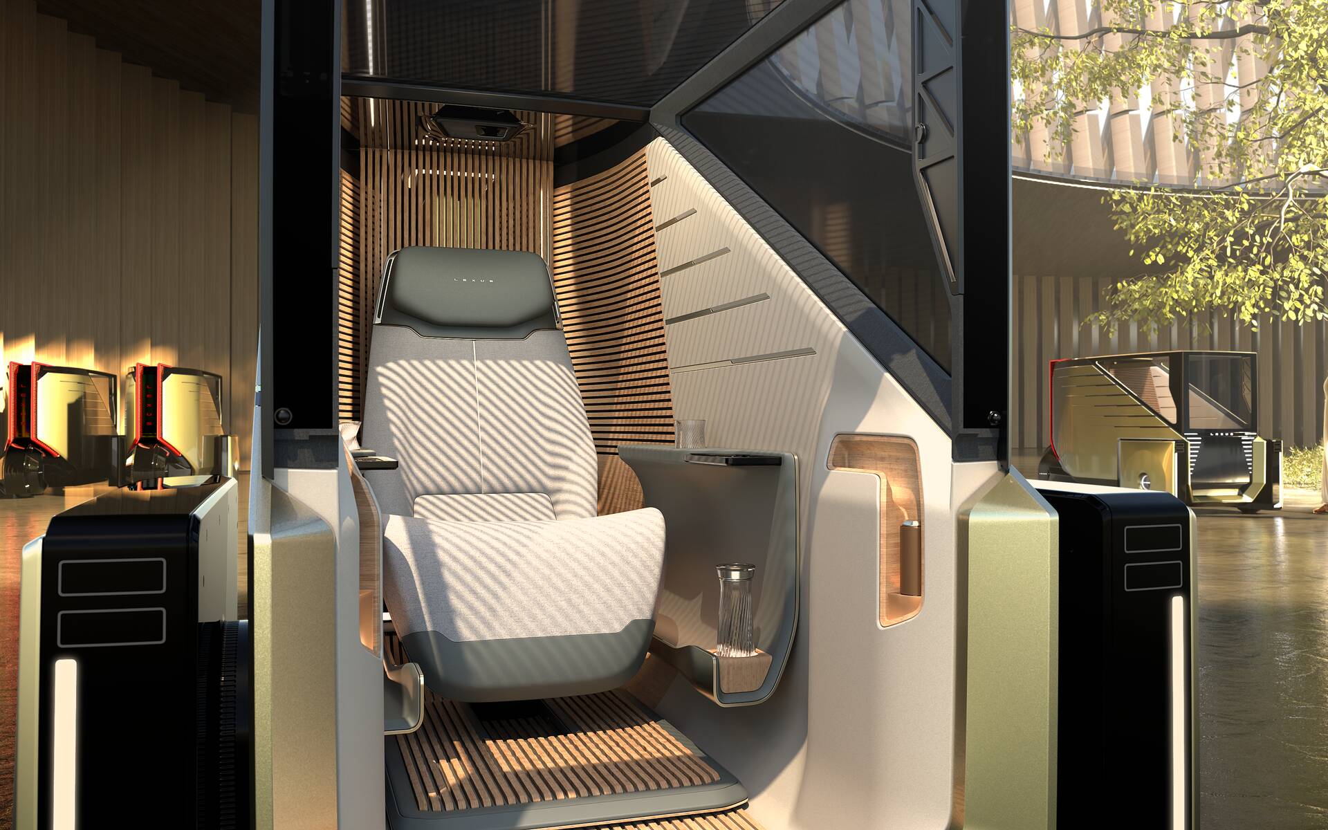 The glass canopy opens like a jewelry box to reveal a serene and luxurious environment that only one occupant is able to enjoy. Genuine wood, glass and other high-end materials come together for a refined look and feel. The absence of a steering wheel and pedals suggests that the LS Micro Concept is fully autonomous.