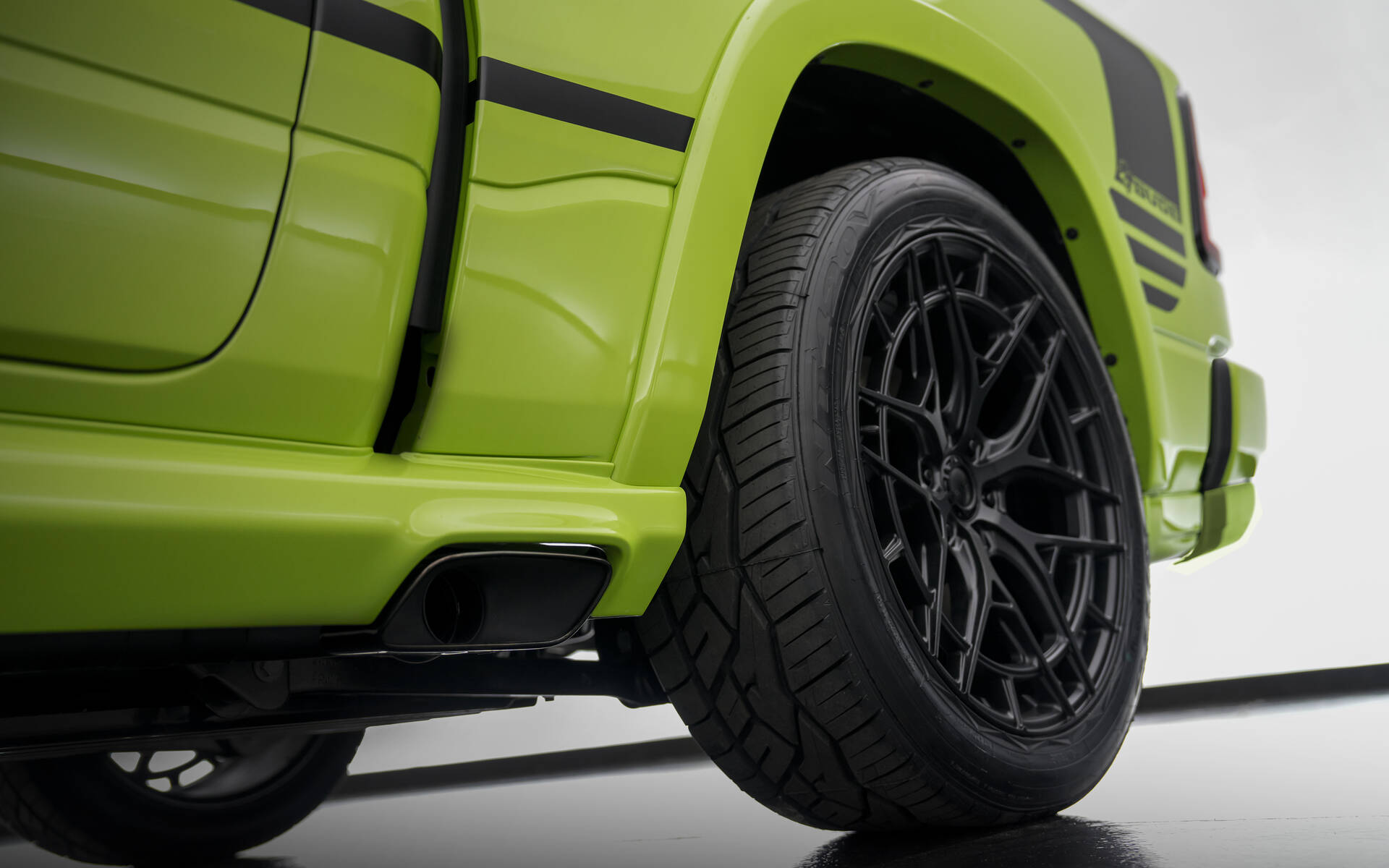 As a proper street truck, the lowered Dude concept rides on large 22x10-inch wheels. A custom front splitter and side sills emphasize the lowered stance. Adding to the performance look, side-exit exhausts with black tips empty out in front of the rear wheels on both sides.