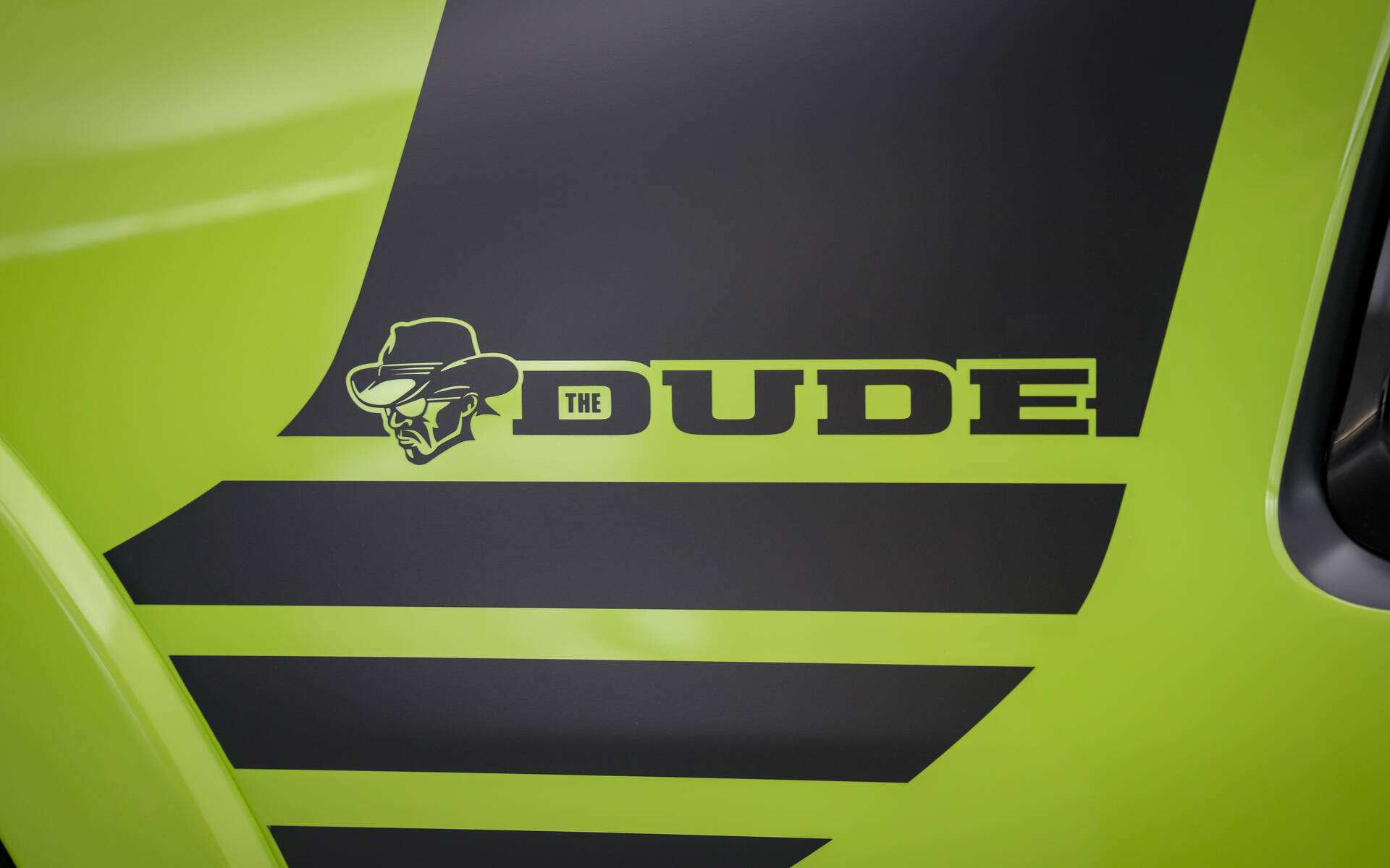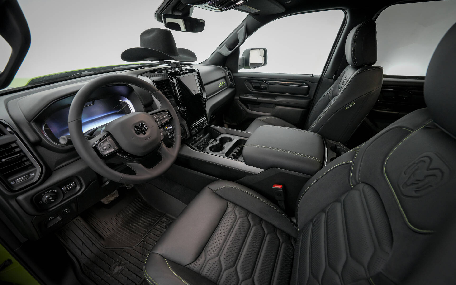 The green and black theme continues inside. The Alea leather seats feature bright green stitching surrounded by dark door trim pieces, while the custom instrument panel badge features The Dude logo in bright green. Mopar has added an in-console safe for securing valuables, a multi-accessory instrument panel rail and all-weather floor mats to finish off the cabin.