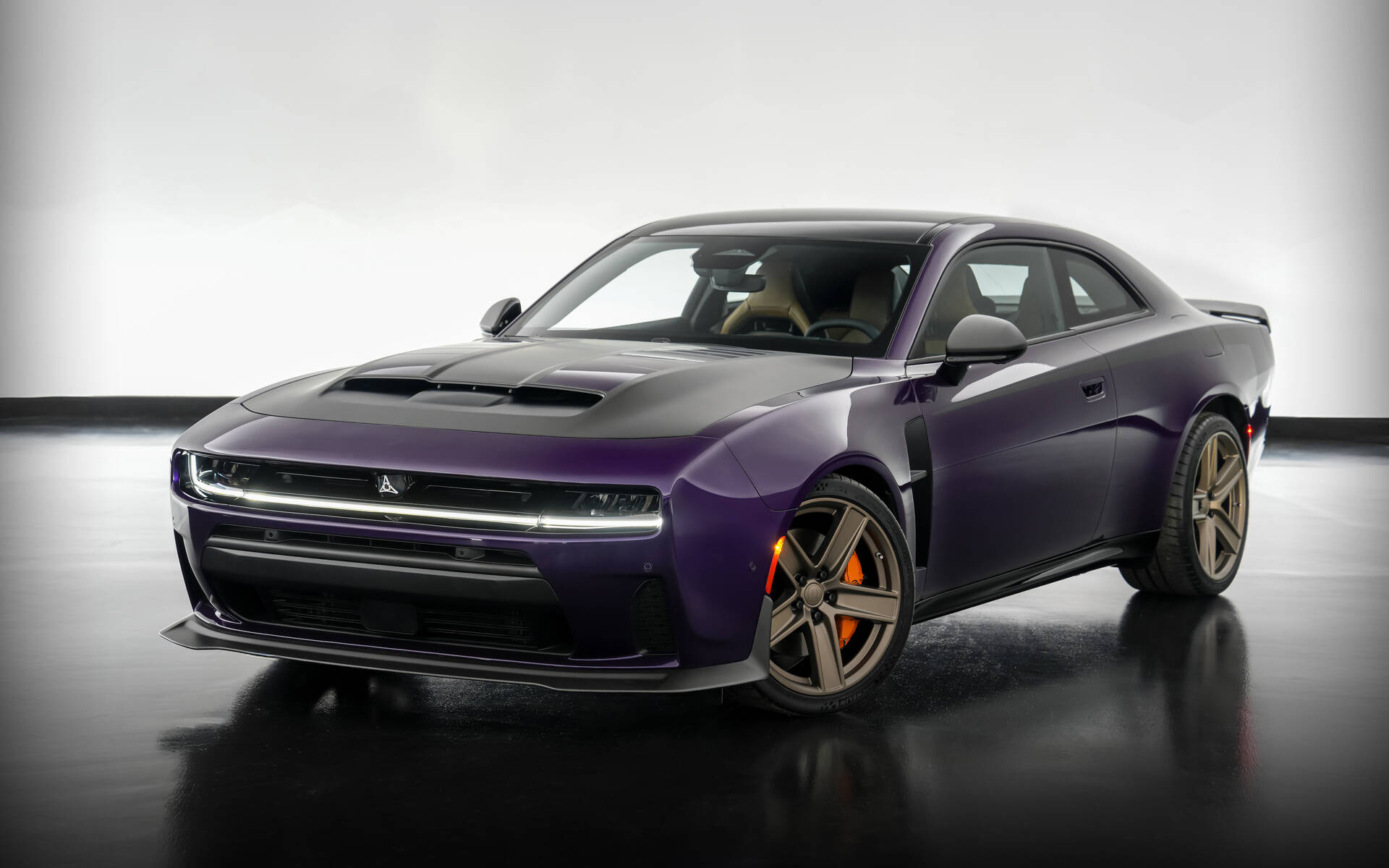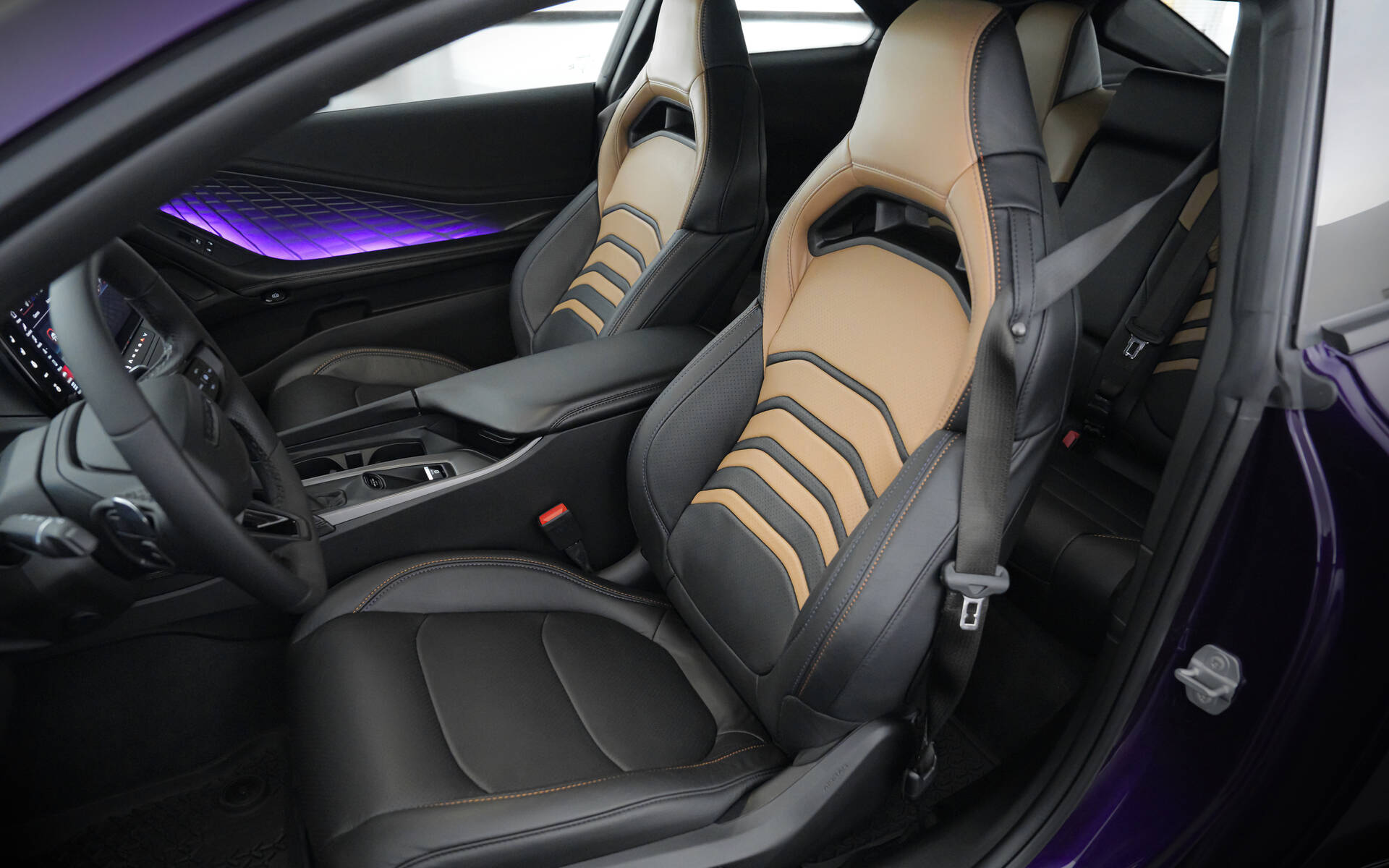 The interior gets Katzkin premium leather seats with contrasting Tuscany Ink (black) and Palomino (tan) surfaces, along with orange and purple stitching.