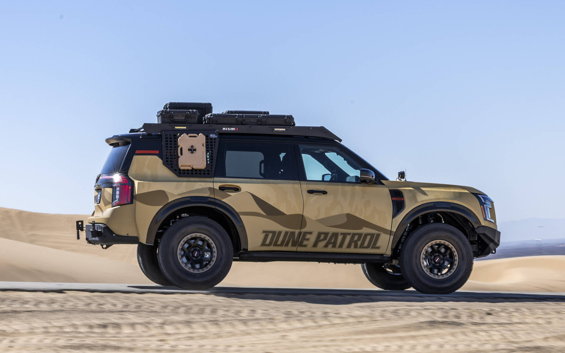 For starters, the Armada transforms into a desert patrol and support vehicle for off-road events and competitions. Based on the rugged Pro-4X model and paying homage to the legendary Patrol sold worldwide since the 1950s, it adopts a long-travel racing suspension, widened fenders and custom 18-inch NISMO AXIS wheels fitted with 37-inch Yokohama Goelandar M/T G003 tires.