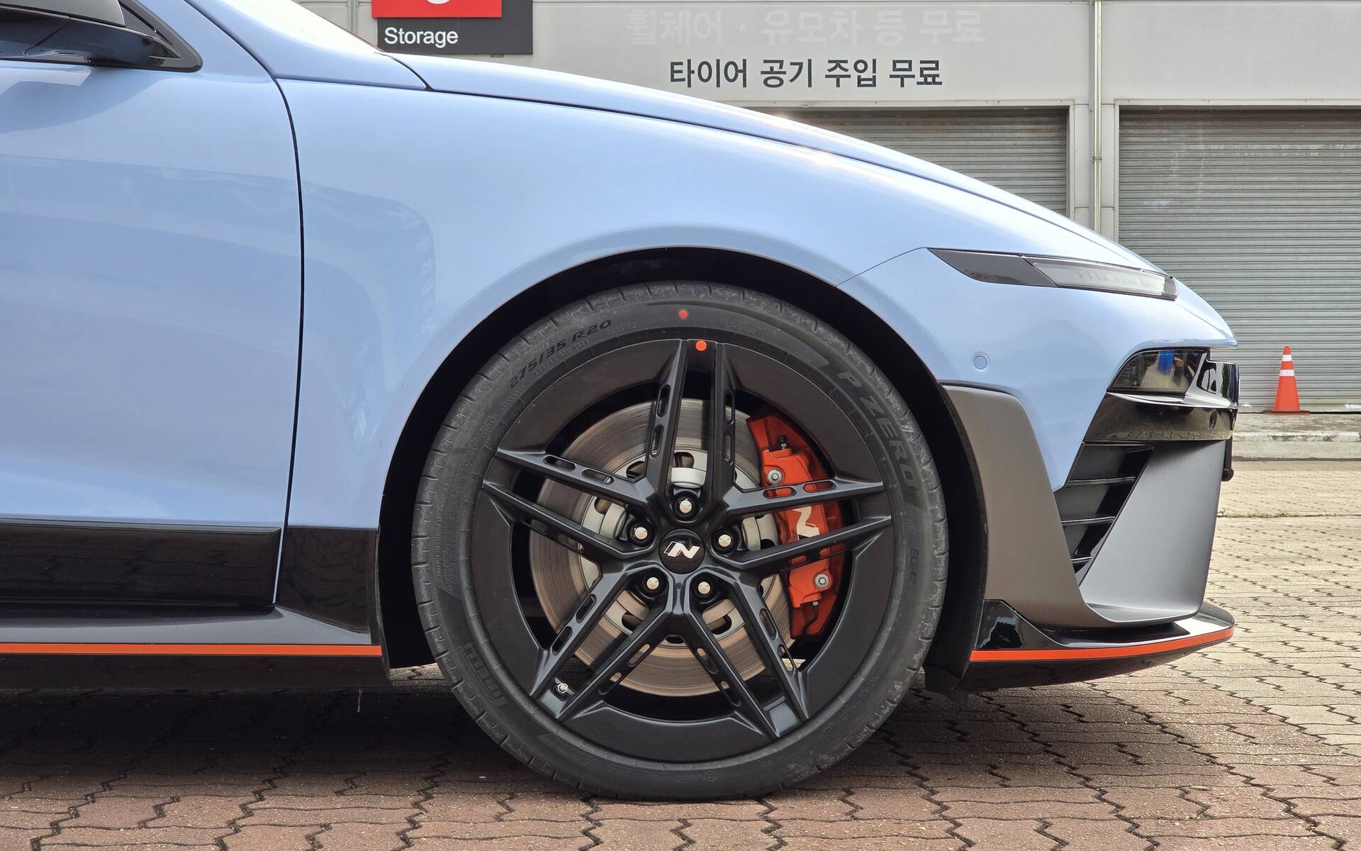 The wheels are 1.5 kg lighter than the stock units, reducing unsprung weight by 6 kg. This weight-saving treatment is complemented by an N-branded suspension upgrade including model-specific shock absorbers and geometry. The primary goal is to lower the IONIQ 6 N’s roll centre by 100 mm compared to the base car.