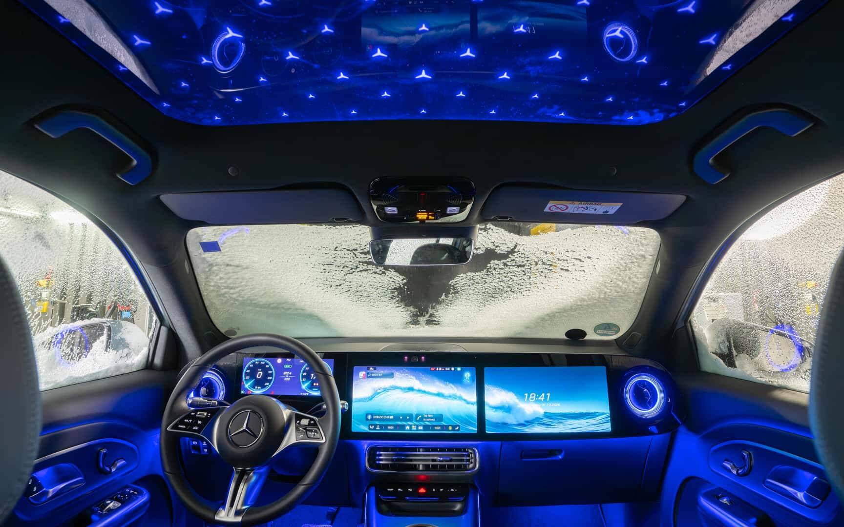What else? The company is talking about increased headroom in the first two rows and extra legroom in the second (a third row will remain optional), as well as a panoramic glass roof that optionally can light up like a starry sky (the stars of course imitating the three-pointed Mercedes-Benz logo) or become opaque at the touch of a button.