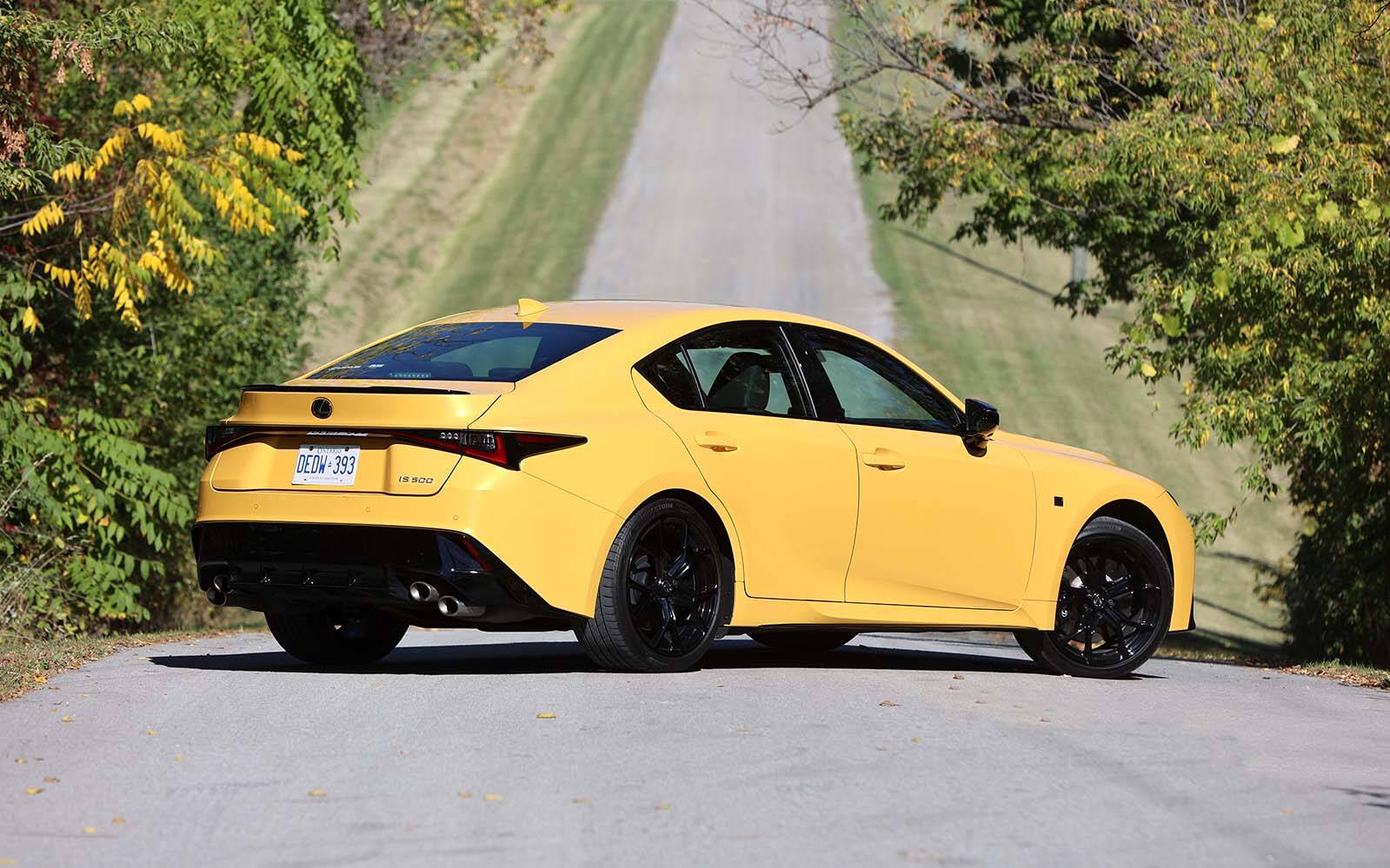 Believe it or not, no fewer than three IS 500 models are available for 2025. The base F-Sport Performance model can be equipped with the + package (as tested), which includes a 360-degree camera monitor and parking assist. Next up is a Special Appearance package featuring 19-inch BBS forged wheels. Finally, there's the Ultimate Edition, finished in white with a black and red interior—not as fancy or head-turning as our bright yellow tester. Only 40 units were allocated to the Canadian market.