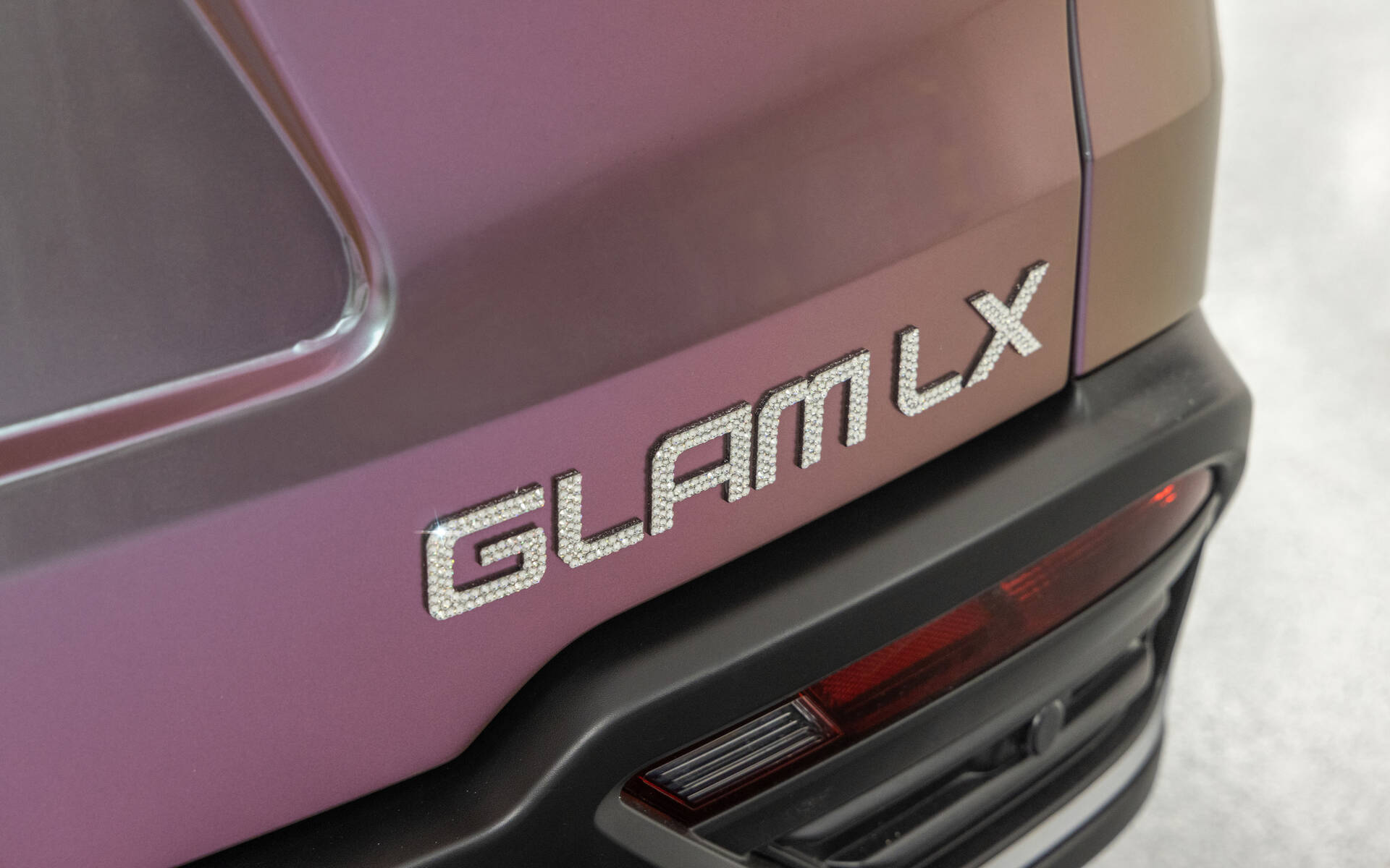 The Glam LX shines in a pearl symphony chameleon wrap. The rear badge is dotted with crystals.