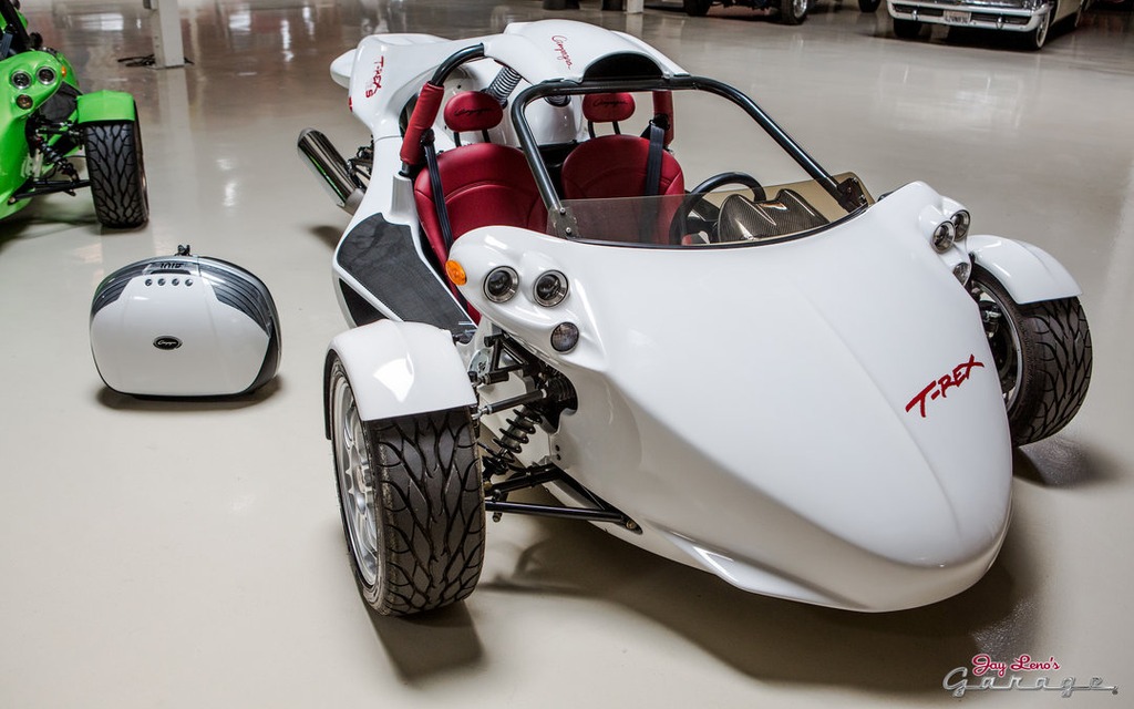 T-Rex : Même le Québec est représenté dans le garage de M. Leno! Fabriqué à Boucherville par l’entreprise Campagna Motors, le T-Rex est le croisement parfait entre la moto et l’automobile.