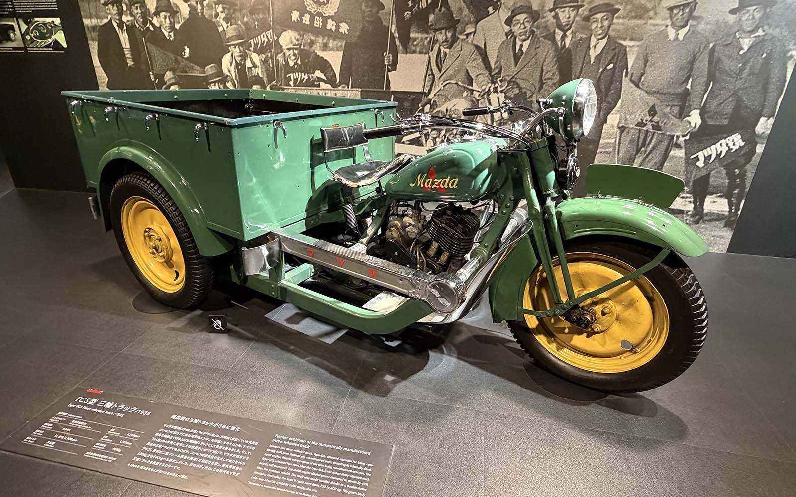 Mazda Three-Wheeled Truck TCS 1935 — Cette camionnette à trois roues n'est pas la plus vieille produite par le constructeur Mazda, qui avait introduit la Type-DA en 1931. Il s'agit toutefois du plus vieux véhicule de la collection du constructeur, doté d'un moteur à un cylindre d'une puissance de 13,2 chevaux, et qui pouvait composer avec des charges atteignant 400 kilos.